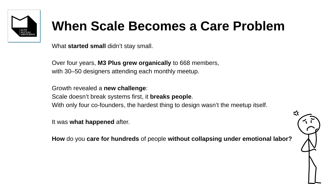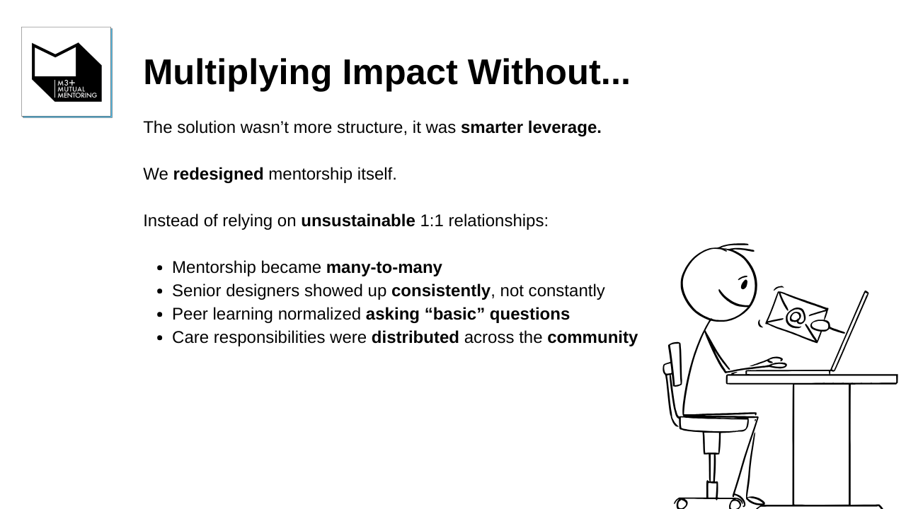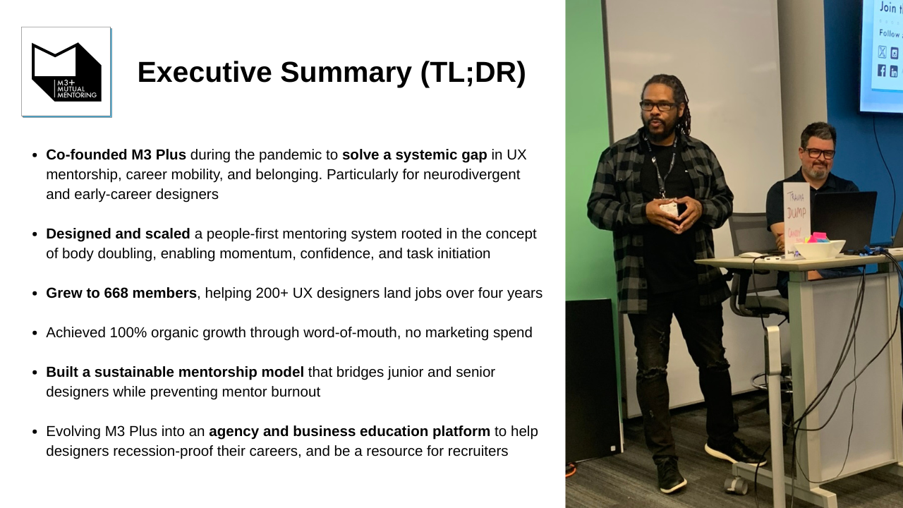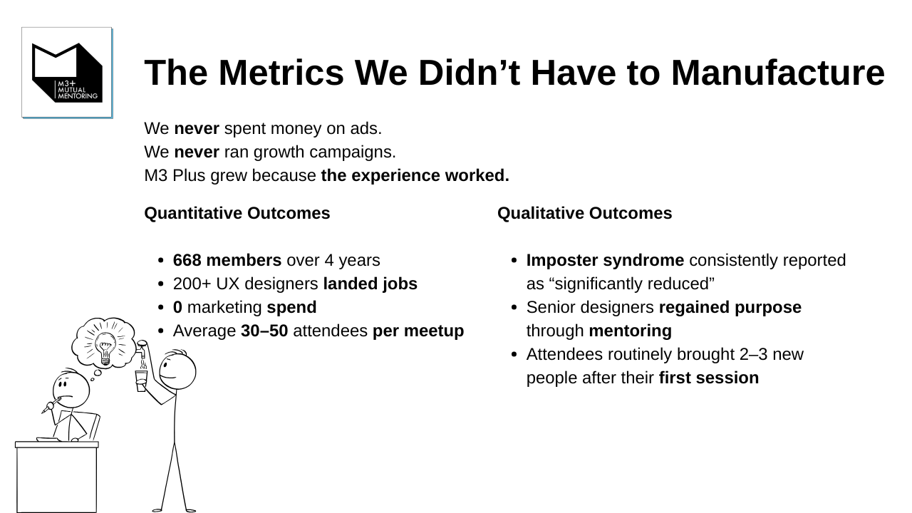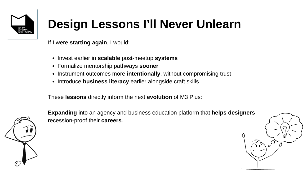 M3+ provides a safe, collaborative space for UX professionals to build portfolios, confidence, and careers. Through co-mentoring sessions, skill-sharing, and authentic connection, members overcome isolation and imposter syndrome. We've helped our community members land roles, elevate their design thinking, and rediscover the joy in their creative journey.