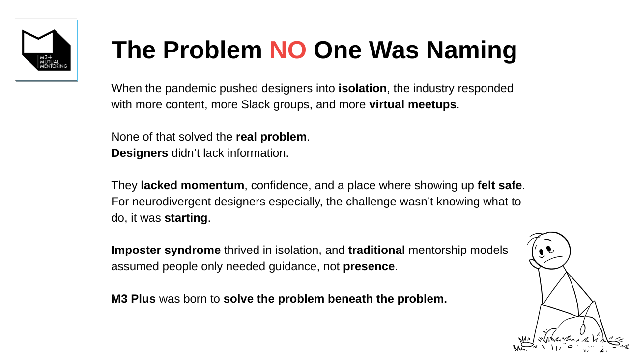 M3+ was born from a real problem: talented, driven UX professionals—especially career changers—were struggling alone. Limited portfolios, scattered experiences, and the overwhelming pressure to “break in” made many question if they belonged.