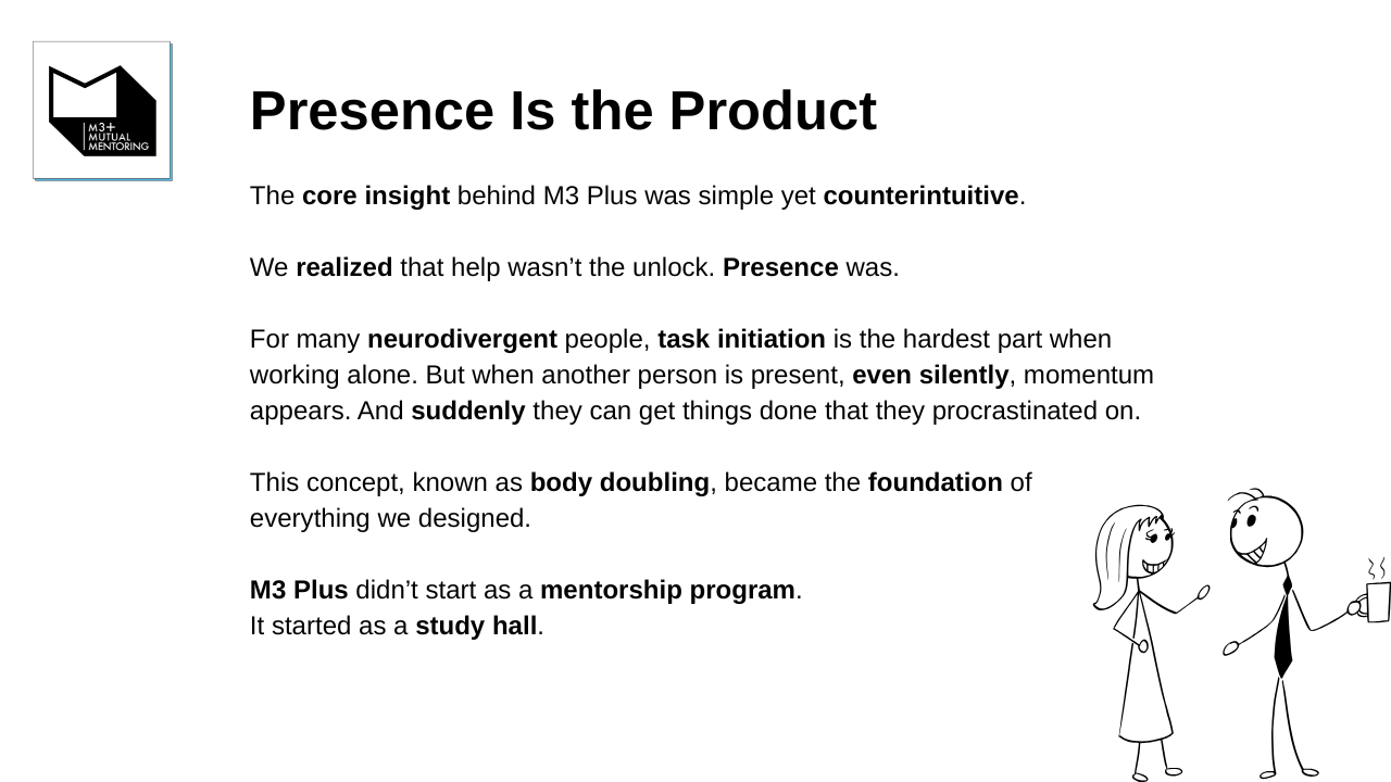 Our founder, facing this exact challenge, discovered a transformative solution: body doubling—the ADHD-friendly practice of working alongside others for mutual motivation.